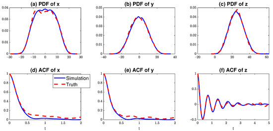 The deterministic Lorenz 63 model [64] is a simplified mathematical model for atmospheric convection. These equations relate the properties of a two-dimensional fluid layer uniformly warmed from below and cooled from above. These equations describe the rate of change of three quantities with respect to time. Physically, x is proportional to the rate of convection, y to the horizontal temperature variation, and z to the vertical temperature variation. The constants , , and are system parameters proportional to the non-dimensional numbers: Prandtl number, Rayleigh number, and certain physical dimensions of the layer itself [65]. In addition to the applications in atmospheric science, the Lorenz 63 model is also widely used as a test model in many other areas, including lasers, dynamos, and chemical reactions [66,67,68,69,70,71,72]. The noisy version of the Lorenz 63 includes more turbulent and small-scale features coming from the unresolved scales. The time series of the noisy Lorenz 63 model thus contains more fluctuations, but they retain the characteristics in the original Lorenz 63. The parameters adopted here are the classical values for the deterministic part together with moderate noise strengths,