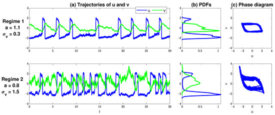 Regime 2: Mixed temporal pattern and irregular oscillations. In this dynamical regime, the temporal patterns are strongly mixed due to the choice of strong noise . The oscillation period of u becomes more irregular as in regime 1. Correspondingly, the PDF of v becomes nearly Gaussian with a large variance. In addition, a small a is adopted in this regime, leading to a relatively short time between two consecutive excitations of u. The following parameters are adopted to generate the true time series for regime 2: