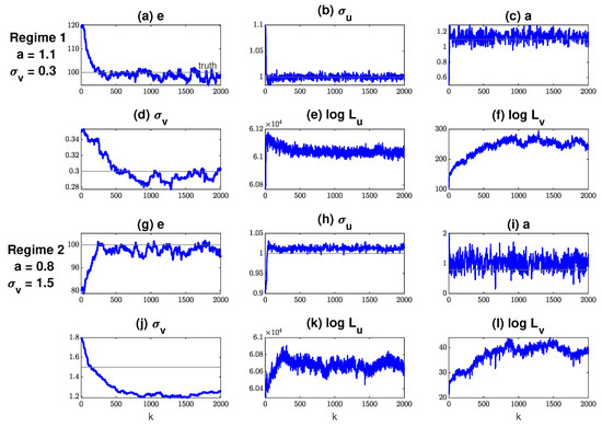 The numerical integration time step is for the test done in Section 4.1, while that for Section 4.2 is , which are also the time step for the discretization in computing the likelihood. A forward Euler scheme is used for computing the likelihood while the stochastic system is solved via the Euler–Maruyama scheme [63]. In all the tests below, a non-informative prior distribution is used for all the parameters in the drift part of the model, which means the same probability is used for as the prior information regardless of its value. For the parameters in the diffusion part of the model, the only knowledge in the prior information is their non-negativity.