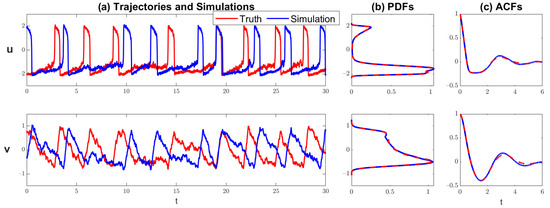 The stochastically coupled FHN model (14) is used as the test model for the parameter estimation algorithm. The model (14) has a single neuron, and it contains the model families with both coherence resonance and self-induced stochastic resonance. The model fits into the conditional Gaussian nonlinear modeling framework, where the observed variable is u and the hidden variable is v. With different choices of the noise strength , (14) exhibits rich dynamical behaviors. The following two regimes are considered for the parameter estimation experiments.