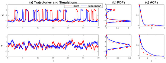 Regime 1: Coherent temporal pattern and nearly regular oscillations. In this dynamical regime, the temporal patterns are highly coherent due to the choice of a weak noise . The time series of both u and v have nearly regular oscillations with large bursts in u around every fixed number of units. The associated statistical equilibrium PDF of u is bimodal while that of v is skewed. The following parameters are adopted to generate the true time series for regime 1: