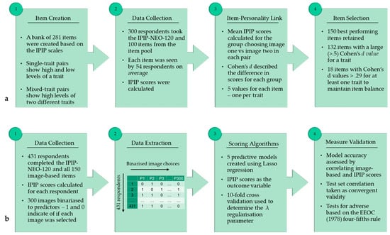 - Study 1—Item Bank Creation: Study 1 describes the creation of an item pool of image pairs, along with the selection of the 150 best-performing items (image pairs), and the mapping of these items to the Big Five traits;
