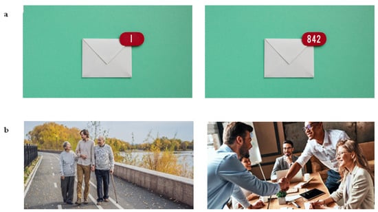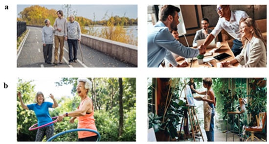 Examples of mixed-trait image pairs. (a) is designed to map onto the “I love to help others” statement from the altruism facet of agreeableness (left) and the “I feel comfortable around others” statement from the friendliness facet of extraversion (right). (b) is designed to be mapped onto the “I act comfortably around others” statement from the friendliness facet of extraversion (left) and “I believe in the importance of art” statement from the artistic interests facet of openness (right).