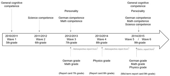 We used data from the German National Education Panel Study (NEPS; Blossfeld et al. 2011). NEPS is a large-scale multicohort, multiwave study on competence development over the life course. We focused on Starting Cohort 3, which is a representative sample of students in Germany who were followed from 5th grade onward and first assessed in 2010. Apart from excluding students attending special schools, we applied no exclusion criteria. We used data from Wave 1 to Wave 6 (see Figure 1). We included all participants who provided data on at least one of the variables or covariates under study in at least one of the waves covered, leading to a final sample of N = 7861 participants (48% female)1. In 7th grade (Wave 3, the first wave with a personality assessment), the average age of the participants was M = 12.93 years (SD = 0.53); 49% were in an academic school track (Gymnasium or Gymnasialzweig).