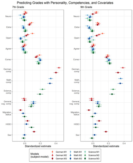 Our results allow for some general observations to be made: First, the increasingly comprehensive models explained increasing amounts of variance (e.g., for German in the 7th grade, for M1, M2, and M3, R2 = .06, .24, and .26, respectively; see also Table S2), suggesting that each set of predictors—personality, competencies, and sociodemographic covariates—was uniquely related to school grades. Averaged across subjects and grade levels, personality explained 4.4% of the variance in grades; this average share of explained variance decreased only slightly to 3.7% when subject-specific and general competencies and covariates were controlled for (see Table S2). Second, the pattern of results was largely similar for the 7th and 9th graders, suggesting only small differences in personality–grade associations across grade levels.5 Third, the pattern of results was similar for mathematics and science but differed for German, which points toward similarities and differences in grading practices across subjects.