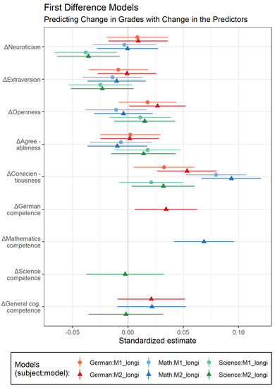 To assess the longitudinal relations between personality and grades, we estimated first-difference models (e.g., Liker et al. 1985). The structure of these models resembled that of the cross-sectional models. However, criteria and predictors were entered as difference scores across the two timepoints (e.g., the German grade in 7th grade was subtracted from the German grade in 9th grade). First, we predicted change in grades from change in personality scores separately for German, mathematics, and science (M1longi). Second, we additionally controlled for change in subject-specific and general cognitive competence scores (M2longi). With their focus on change, first-difference models implicitly control for the influence of (unobserved) time-invariant covariates (e.g., Liker et al. 1985). We therefore did not include the (time-invariant) sociodemographic covariates in these models.