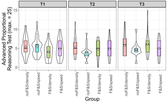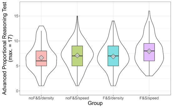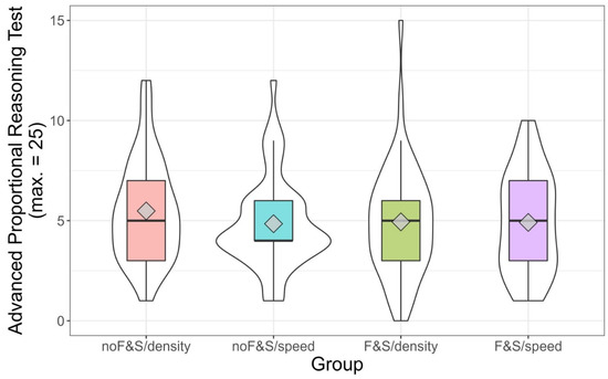 Score on the advanced proportional reasoning test by group in Study 1. Violin plots (white) and boxplots (colored). The diamond depicts the mean value per group.