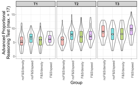 The correlation between intelligence and achievement in the advanced proportional reasoning tests varied between the groups and was highest in the F&S/density group (r = .37, p = .01). In the other three groups, it varied between r = −.14 and r = .08. To further scrutinize potential interactions between intelligence and group, we split intelligence scores into terciles. Figure 3 depicts the means, medians, and the distribution of the scores in the advanced proportional reasoning test. In the F&S/density group, the increase from the lowest to the highest tercile was most obvious. In the upper third of intelligence, some students of this group reached the highest scores in proportional reasoning.