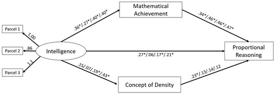 In addition to the between-group comparison of mean achievement, the statistical power of Study 2 also allowed us to run mediation analyses. We, therefore, investigated, for each of the four groups, whether the relation between intelligence and achievement on the advanced proportional reasoning test presented after the training was fully or only partly mediated by prior knowledge. We presented students with a test on mathematical knowledge, including multiplication, division, and word problems—tasks considered an important basis for proportional reasoning no matter which example was used in the training. We expected similar mediation effects for the four groups, as they all underwent comparable mathematics instruction. The second measure of prior knowledge that we included was a test on the conceptual understanding of density with which students entered the training. A substantial relation between intelligence and the pretest score was expected for only the two F&S groups, as only these students were given the chance to acquire conceptual knowledge about density. In accordance with the investment theory of intelligence, the higher people’s intelligence, the more they are expected to gain from learning opportunities. However, only the F&S/density group could make use of their knowledge about density during the proportional training. In this group, knowledge about density would, therefore, likely mediate the relationship between intelligence and achievement in the advanced proportional reasoning test.