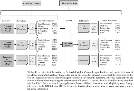 Figure 3 also indicates that when the additional term “Education (EDU)” is included in the filter for each of the previous potential synonyms of complex thinking, a smaller number of 153 documents and 1407 citations are generated for the first term, 47 documents and 472 citations for the second term, and then, after the filter, the 5 documents and 7 citations are maintained for the third term which seems to be directly linked to the field of education. After this new filter, it is evident, despite the decrease in research, that complex thinking in general within education maintains a more notable relationship with the social sciences concerning other disciplines.