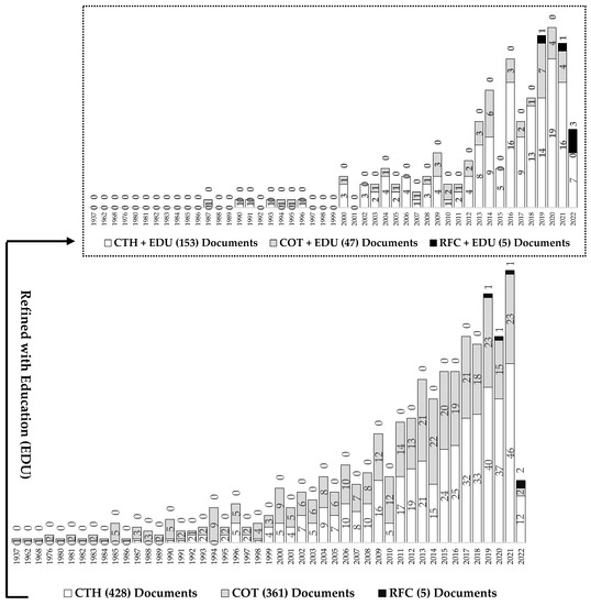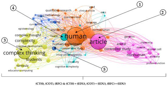 Table 2 also shows how, with the filter “complex thinking (CTH)” and “education (EDU)”, there are 1407 citations in Scopus. Then, when analyzing the most cited documents, it is identified that they come mainly from the United States universities, such as Stanford University, University of California, University of Connecticut, Claremont McKenna College, and University of Maryland, among other universities that join the top five. With the filter “complex thought (COT)” and “education (EDU)”, there are 472 citations which, when analyzing the most cited document in this category, comes from Vanderbilt University in the United States with a total of 184 citations, in addition to the other universities that complete the ranking of the top five. Finally, with the filter “reasoning for complexity (RFC)” and “education (EDU)”, there are only seven citations, which come from Friedrich–Alexander University Erlangen and the International School of Management, both from Germany, as well as from Tecnológico de Monterrey in Mexico, which shows how recent this last field is within the central theme of this article.