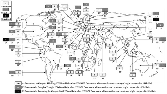 In the third part, the origin of such publications is determined by country and by the regions where most work is conducted on the central theme of this work, focusing on the areas of “complex thinking (CTH)”, “complex thought (COT)”, and “reasoning for complexity (RFC)”, each of these combined with “education (EDU)”. It is important to note that the number of papers, see Figure 5, does not coincide with most of the total publications previously indicated, (153 and 47 papers—except the last case of 5 papers) because Scopus counts the origin of the papers according to the origin and the number of authors of the papers, who evidently can be from different places. This means that the same document can be registered several times in the database to recognize the origin of one or more authors who may originate from different countries.