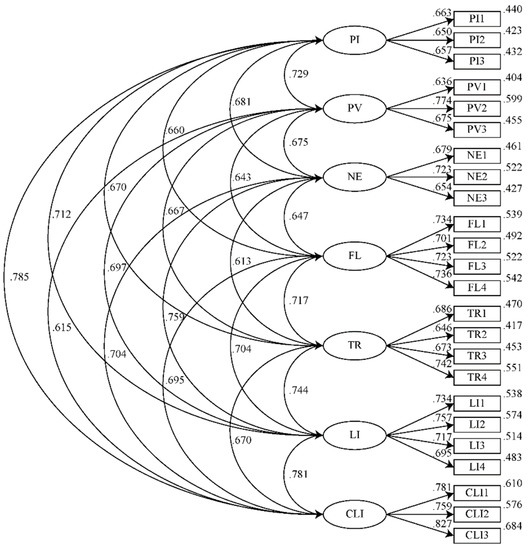 SPSS26 and AMOS22 were used to analyze the data in this phase of the study. PV4 and NE4 were deleted because their communalities were below .5, except LI5. We performed the following analysis after deleting the data. First, we tested the reliability of the questionnaire using Cronbach’s alpha. The analysis is shown in Table 3. The test result indicated that the corrected item total correlation value exceeded .4. Cronbach’s alpha of each construct was greater than .6, and the new reliability value after deleting the item was lower than the current reliability value. Overall, the construct was reliable (Santos 1999).