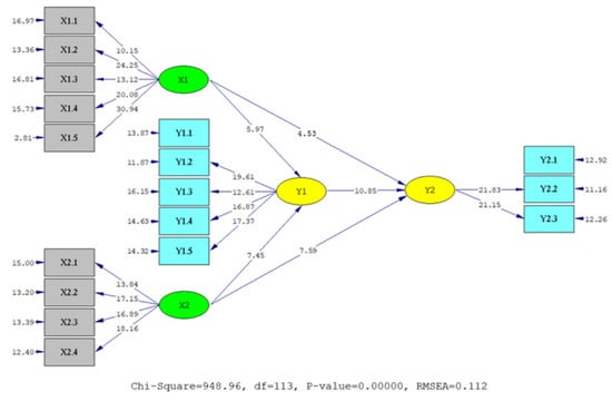 T-value structural model. Note: X1 = EI, X2 = AQ, Y1 = OCB, Y2 = Teachers’ professional competence.