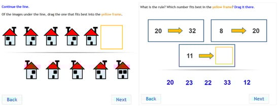 The IR instrument (see Figure 4) was originally designed and developed in Hungary (Csapó 1997). In the last 25 years, the instrument has been further developed and scaled for a wide age range (Molnár and Csapó 2011). In addition, figural items have been added, and the assessment method has evolved from paper-and-pencil to computer-based (Pásztor 2016). Currently, the instrument is widely employed in a number of countries (see, e.g., Mousa and Molnár 2020; Pásztor et al. 2018; Wu et al. 2022; Wu and Molnár 2018). In the present study, four types of items were included after test adaptation: figural series, figural analogies, number analogies and number series. Students were expected to ascertain the correct relationship between the given figures and numbers and select a suitable figure or number as their answer. Students used the drag-and-drop operation to provide their answers. In total, 49 inductive reasoning items were delivered to the participating students.
