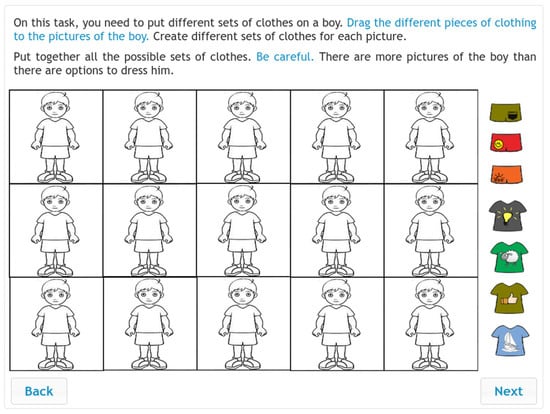 The CR instrument (see Figure 5) was originally designed by Csapó (1988). The instrument was first developed in paper-and-pencil format and then modified for computer use (Pásztor and Csapó 2014). Each item contained figural or verbal elements and a clear requirement for combing through the elements. Students were asked to list every single combination based on a given rule they could find. For the figural items, students provided their answers using the drag-and-drop operation; for the verbal items, they were asked to type their answers in a text box provided on screen. The test consisted of eight combinatorial reasoning items in total.