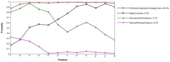 The patterns for the four qualitatively different exploration strategy profiles are shown in Figure 6. In total, 84.3% of the students were proficient exploration strategy users, who were able to use VOTAT in each problem scenario independent of its difficulty level (represented by the red line in Figure 5). In total, 6.2% of the students were rapid learners. They were not able to apply VOTAT at the beginning of the test on the easiest problems but managed to learn quickly, and, after a rapid learning curve by the end of the test, they reached the level of proficient exploration strategy users, even though the problems became much more complex (represented by the blue line). In total, 3.1% of the students proved to be non-persistent explorers, and they employed VOTAT on the easiest problems but did not transfer this knowledge to the more complex problems. Finally, they were no longer able to apply VOTAT when the complexity of the problems increased (represented by the green line). In total, 6.5% of the students were non-performing explorers; they barely used any VOTAT strategy during the whole test (represented by the pink line) independent of problem complexity.