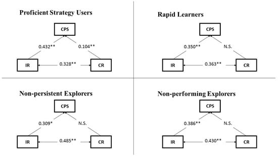 Path analysis models (with CPS, IR and CR) for each type of strategy user; * significant at 0.05 (p < 0.05); ** significant at 0.01 (p < 0.01); N.S.: no significant effect can be found.