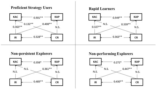 Path analysis models (with KAC, KAP, IR and CR) for each type of strategy user; * significant at 0.05 (p < 0.05); ** significant at 0.01 (p < 0.01); N.S.: no significant effect can be found.