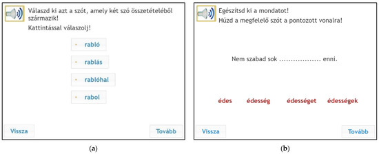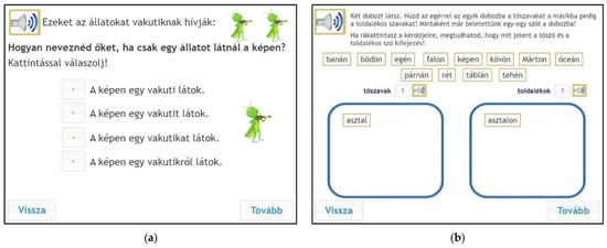 The testing procedure took place in a group setting in schools’ ICT labs using the eDia platform (Csapó and Molnár 2019; Molnár and Csapó 2019). The entire testing procedure was conducted within a 45 min lesson. Children could listen to the instructions during the test, and they had to provide their answers by clicking on the right answer or dragging words into a box on the monitor (see Figure 1, Figure 2 and Figure 3). Instant feedback was given after completing the test, and the teachers could also download the detailed results within the eDia system with a supplement document which helped them interpret the results. Before the test became available, the schools belonging to the eDia system received a brief description of the instrument assessing children’s morphological awareness and reading comprehension skills. The assessment guideline gave details about the aim of the testing and about how to conduct the data collection. It also explained what skills and subskills it measured, why it could be useful for the children and for the teachers, and included sample tasks as well. The schools were asked to provide headphones for the children willing to take part in the survey. In addition to the scores, teachers could also download a detailed description of the test and personalized feedback for each child. It contained written feedback for different achievement categories and a spider web diagram which showed the performance of a given child as well as the average performance of the given grade. We applied all relevant ethical guidelines of educational research including privacy, confidentiality, and data management during the research process. Parental consent was asked for, and anonym assessment identifiers were used for logging into the test platform.