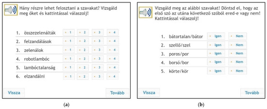 Samples from the morpheme segmentation subtest. Left (a): nonwords, instruction: “How many parts do the following words consist of? Answer by clicking”. Options: they have zelened together, 2. upzandalments, 3. I am zelening, 4. robotlambóc, 5. lambóclessness, 6.to zandal away. Right (b): relational task, instruction: “Examine the following words carefully. Decide whether we form the first word from the second word? Answer by clicking. Options: discouraged/courage, 2. breeze/breed, 3. dusty/dust, 4. pea/pit, 5. pear/pea.