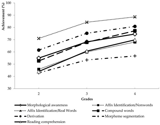 Figure 5 shows the developmental patterns of morphological awareness skills and reading comprehension graphically. Continuous lines represent morphological awareness and reading comprehension. Dashed lines refer to the different subskills of morphological awareness. The same patterns represent the subskills corresponding to a specific dimension (e.g., dotted lines correspond to inflectional morphology). The different skills develop in parallel with each other and with reading comprehension as well. In all cases, a tendency can be noticed that the degree of the development tends to be faster between grades 2 and 3 compared to grades 3 and 4.