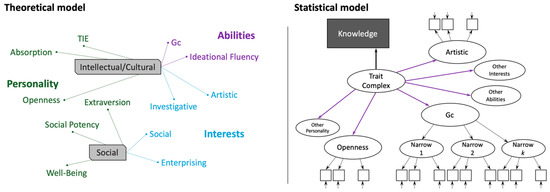 The demarcation between a composite vs. causal indicator is difficult to resolve. The identification of trait-complexes (Ackerman et al. 2013) present a potentially illustrative case in point. Ackerman and Heggestad (1997) proposed that there are four trait-complexes, two of which are represented in Figure 1 (left panel), that each encompass an overlapping set of different traits from the domains of personality, abilities, and interests (additional trait-complexes were subsequently included, see Ackerman et al. 2013). “Validity” of trait-complexes is purportedly evidenced by their differential prediction of domain-specific knowledge acquisition. For instance, the intellectual/cultural trait-complex was captured by Gc and ideational fluency abilities, artistic and investigative interests, and absorption, openness, and typical-intellectual engagement personality dimensions.