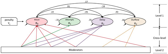 Variability in the individuals’ π0j, π1j, and π2j parameters is considered at level 2 (in Equations (2)–(4), respectively). β01 represents the change in the individuals’ mean scores as a function of W, a variable that differs between people; and β11 and β21, respectively represent the change in the individuals’ X and Z slope parameters, also as a function of W. Accordingly, β11 and β21 are cross-level interaction parameters. For completeness, β00, β10, and β20 represent the sample’s average mean and slope (conditional on level 1 and level 2 variables). One might also be tempted to make a distinction between types of level 2 variables analogous to that made between X and Z. For instance, W might reflect inherent individual differences, such as age or conscientiousness, whereas V (Equation (2)) might represent a factor external to the individual, such as a between-condition manipulation (e.g., group 1 gets contextualised feedback, and group 2 gets generic feedback). While the latter is of potential scientific interest and allows for experimental group comparisons for the purpose of, say, validating an operationalisation of cognitive flexibility, our focus here is specifically on within-person processes and how they might differ from one person to another. Accordingly, this type of between-condition comparison is not a factor directly of relevance in building a conceptualisation and measure of cognitive flexibility.