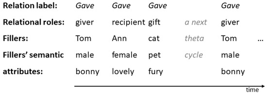 Figure 1. An example of temporal pattern of bindings in LISA’s representation of the relation instance Gave (Tom, Ann, cat).