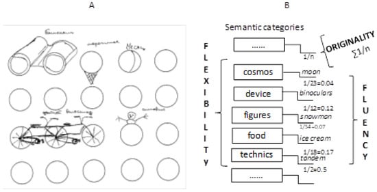 (A) An example of a fulfilled RF test; (B) The creativity indicator calculation scheme in the software for the same example.