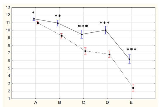 The results for the five series in Raven’s test are presented in Figure 2. According to the between-group comparisons, all the scores in Gr_2 were higher than in Gr_1 (Mann–Whitney p < 0.0002). Figure 2 demonstrates that the age-related differences in the test performance increase together with the increasing sophistication from series A to series E.