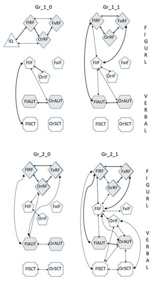 Gr_1_0 had less pronounced relationships between the different indicators of verbal and figural creativity compared to Gr_1_1. Also, only Gr_1_0 had significant relationships with IQf. Gr_2_1 had the tightest relationships between the various indicators of creativity compared to other groups, particularly for the indicators of verbal creativity FlSCT and OrSCT, whose relationship was significant in Gr_2_1 only (see Figure 2).