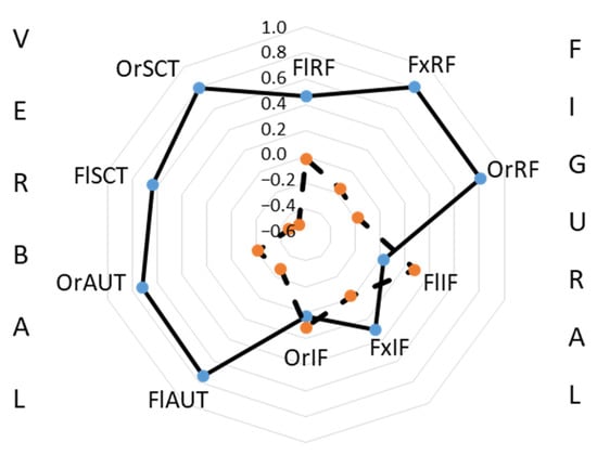The comparison of the sub-groups differing in academic scores has revealed a significant difference only for OrIF in Gr_2, with higher values of the indicator in Gr_2_1 than in Gr_2_0 (p < 0.04). There was also the trend towards higher values of FlSCT in Gr_2_1 compared to Gr_2_0 (p < 0.1), as well as of FxRF and FlAUT in Gr_1_1 compared to Gr_1_0 (p < 0.1).