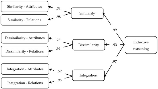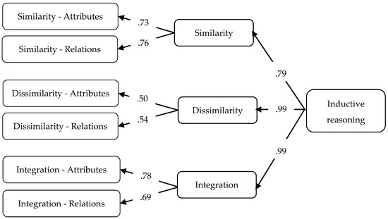 () also developed an instrument but using mathematical content (i.e., numbers) and conducted a study among five graders. They suggest that three key cognitive processes should be identified based on Klauer’s model: processes dealing with similarities of attributes and relations (Similarity: Generalisation, Recognizing relationships), processes dealing with dissimilarities (Dissimilarity: Discrimination, Differentiating relationships) and Integration where both similarities and dissimilarities have to be taken into account to solve a particular task (Cross classification, System construction). In their model, they included the six processes as a first order factor, they defined the three key cognitive processes as a second order factor, and a third order factor was also formulated representing inductive reasoning as a general latent construct. Figure 1 shows the model visually with the factor loadings. The proposed model was consistent with the data; they reported good fit indexes (). Thus, the results suggested that the six processes and the three key cognitive processes could be empirically distinguished. However, so far no research confirmed the construct validity of the model in the case of applying domain general stimuli such as items with figurative content.