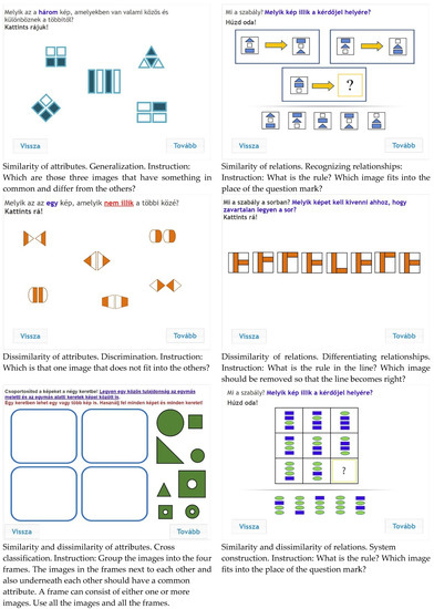 Besides the item types presented for the assessment instrument, further task schemes were also applied to increase the variability of the activities. For example, for Generalization class formation and class expansion tasks were also used, in some differentiating relationship tasks, students had to find those elements which had to be swapped or in cross classification tasks, the four sets were already filled, and students had to find the correct settings for a given element (see Figure 3). Furthermore, reducing the trial-and-error strategy we tried to develop as many open-ended training tasks as possible. For example, in series completion tasks, students had to type the numbers instead of choosing one from four alternatives.