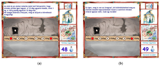 Samples for feedback in the training program at the end of the feedback loop. (a) In case of a third unsuccessful trial of the learning task, instruction: The first and the last relation symbols should have been swapped to make all the statements true. Namely, 10 dg is smaller than 1 kg, and 100 g is equal to 10 dg. Don’t be discouraged; let’s get the next potion of water of life. (b) In case of the correct solution of the task: Well done, you’ll get the bottle. You have differentiated the relations between the objects correctly. With this swap all the statements are true. Keep it up.