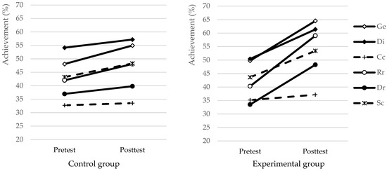Changes in performance regarding the inductive reasoning processes for the control and the experimental group. Note: Ge: Generalization, Di: Discrimination, Cc: Cross classification, Rr: Recognizing relationships, Dr: Differentiating relationships, Sc: System construction.