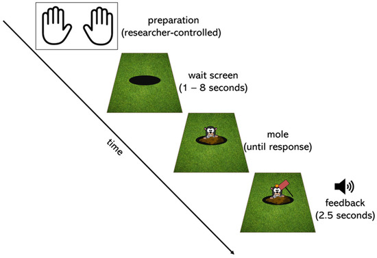 Graphical depiction of the task sequence. Each trial was initiated by the experimenter, ensuring that the child was in position (preparation). A black circle (a hole) on a green background (grass) then appeared for a random time wait interval ranging from 1 to 8 s (wait screen). After this interval, a mole appeared, and the child’s task was to press the button on the response box as quickly as possible (mole). When they did so, a hammer came down on the mole, and a laughing sound played for 1.5 s (feedback). Stars on the right-hand side of the screen told participants how many trials they had completed in the block. The preparation screen for the next trial then began.