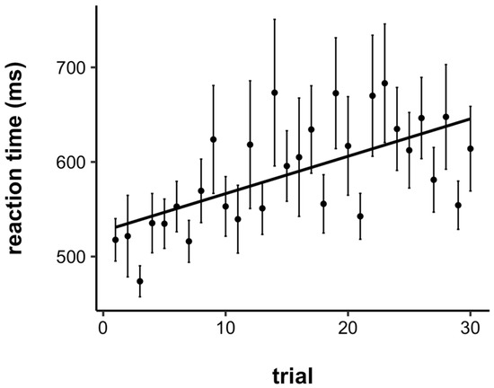 Average reaction time by trial. Children showed a significant vigilance decrement, with reaction times slowing across the course of the task. Error bars represent +/− one standard error.