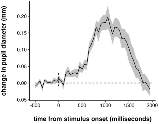 Grand-averaged task-evoked pupillary response. Shaded error bar represents +/− one standard error.