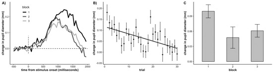 (A) Waveforms of the task-evoked pupillary response by block, (B) Average change in pupil size at target onset for each trial, (C) Average change in pupil size at target onset across each block. Error bars represent +/− one standard error.