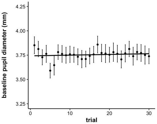 We additionally examined time-on-task effects on the baseline pupillary response. To examine the baseline pupillary response statistically, we computed the average pupil diameter during the first second of the waiting period for each trial. Then, we submitted these values to a linear mixed effects model with a fixed effect of trial (continuous, mean-centered) and a random effect of participant. Both the intercept and slope were allowed to vary across participants. There was no significant effect of trial on the baseline pupil diameter, showing that overall, baseline pupil diameter did not significantly change with time-on-task (b = 0.001, SE = 0.001, p = 0.47; see Figure 5).