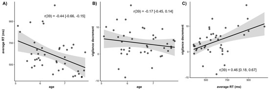 In Figure 6, we have plotted correlations among average RT, the magnitude of the vigilance decrement, and age. There was a significant negative correlation between age and average RT (r(39) = −0.44, 95% CI = [−0.66, −0.15], p = 0.004; Figure 6A). Older children had faster RTs than younger children. There was a negative but non-significant correlation between the magnitude of the vigilance decrement and age (r(39) = −0.17, 95% CI = [−0.45, 0.14], p = 0.28; Figure 6B). This indicates a trend for older children to have a smaller vigilance decrement than younger children. There was a significant positive correlation between average RT and the magnitude of the vigilance decrement (r(39) = 0.46, 95% CI = [0.18, 0.67], p < 0.001; Figure 6C), such that children who were slower overall also tended to show larger vigilance decrements.
