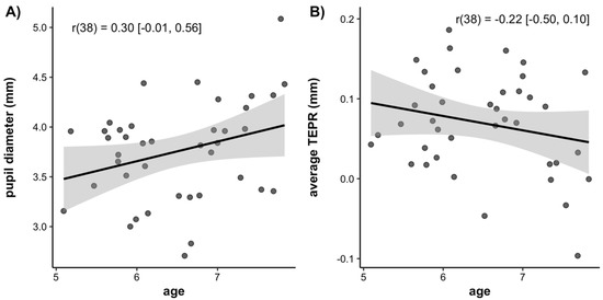 Scatterplots of the correlations between (A) Age and average baseline pupil diameter, (B) Age and average task-evoked pupillary response. Lines of best fit are drawn through the data points with associated standard errors. Correlation values are listed with the 95% confidence interval around the estimate.