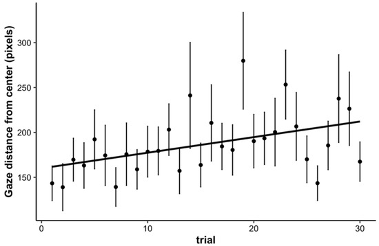Average distance from the center of the screen of children’s fixations (in pixels) across trials. Children showed a significant increase in distance from center over the course of the task. Error bars represent +/− one standard error.