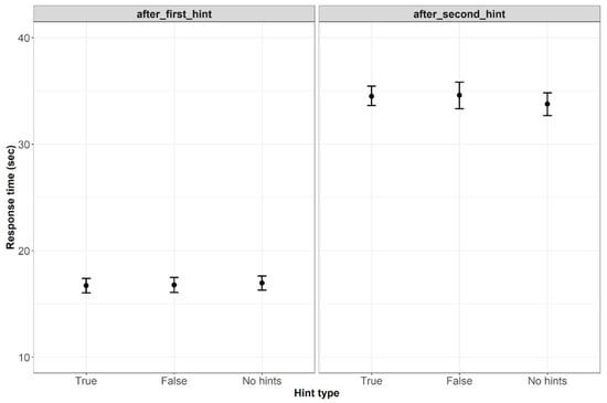We expected shorter response times for correct solutions given after true hints and longer response times for correct solutions given after false hints. As the hints were presented twice, we built two separate models for the first presentation (10–25 s interval) and the second presentation (25–40 s interval). In both models, the fixed effects were hint type, the frequencies of the solution, and short words; stimuli and participants served as random effects. The dependent variable was the response time in the 10–25 s interval for the first model and the response time in the 25–40 s interval for the second model. The model for the first time interval (10–25 s) was not significant (χ2(2) < 1) but showed an individual positive effect of the frequency of short words (β = .009, SE = .004, t = 2.01, p < .05), which indicates that the higher frequency of the short word is associated with longer response times in correct solutions obtained after the first hint. The model for the second time interval (25–40 s) was not significant either (χ2(2) = 2.801, p = .247). However, this model also revealed the positive effect of the short word frequency (β = .02, SE = .007, t = 3.09, p < .01). This indicates that the higher the frequency of the short word is, the more time is required to solve the anagram after the second hint was presented. Figure 2 shows the average response times for correct solutions obtained after the first and the second hints.