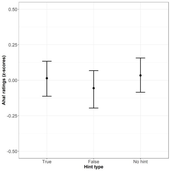The model with hint type as a predictor did not differ significantly from the model without this predictor (χ2(2) = 4.605, p = .10). We built another model with the true hint as an intercept. The model was also not significant (χ2(2) = 4.605, p = .10) but showed an individual effect of the false hints (β = −.26, SE = .01, t = −2.152, p < .05). This indicates that Aha!-experience ratings are lower for solutions given after false hints than after true hints. Figure 4 shows the average Aha!-experience ratings across different hint types.