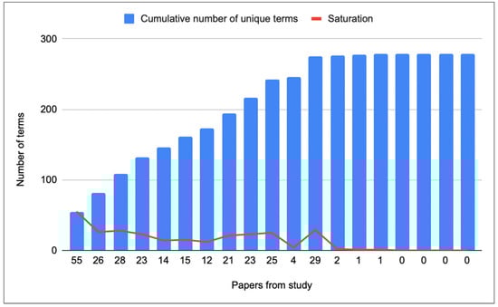 Saturation level as the number of novel terms added by a subsequent article. The papers were processed in the same order as in Table 2. The x-axis corresponds to the new terms provided by each paper after analyzing them in order.