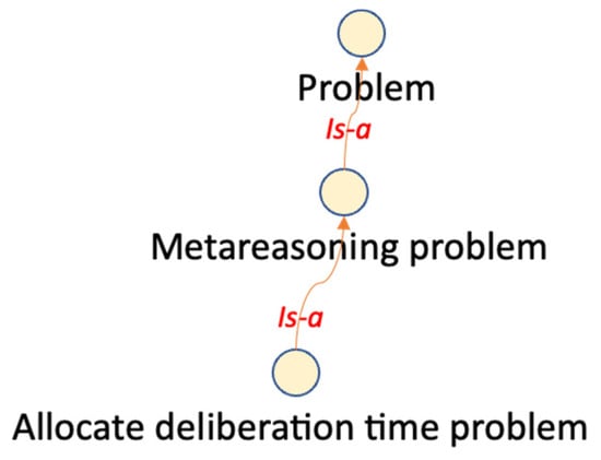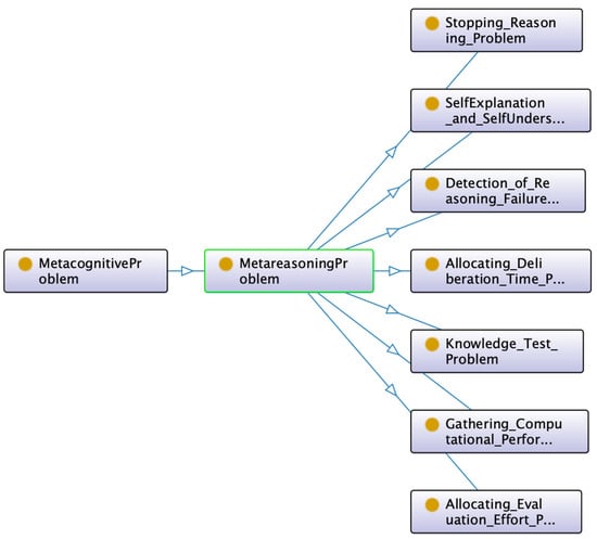 A METAREASONING_PROBLEM is a class that represents the problem an agent has of monitoring and controlling the progress of its own reasoning and problem-solving activities and regulating the time and effort spent on them (Ackerman and Thompson 2017). This definition is a good example of the creation of inferred abstract concepts such as the concept PROBLEM. The PROBLEM class is considered part of the core of the ontology because it is used by all the sub-ontologies. In the proposed design, every PROBLEM is part of a PROBLEM_SPACE and has a SOLUTION. The meta-level analyzes the DEFAULT_SOLUTION for potential anomalies or optimizations after the object level generates it.