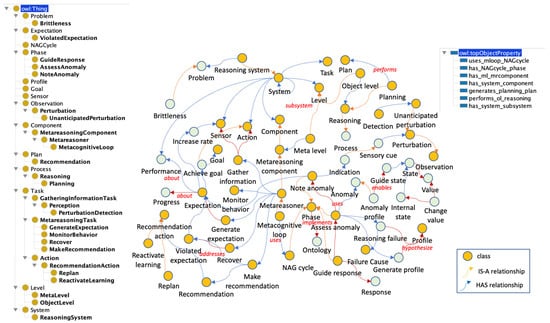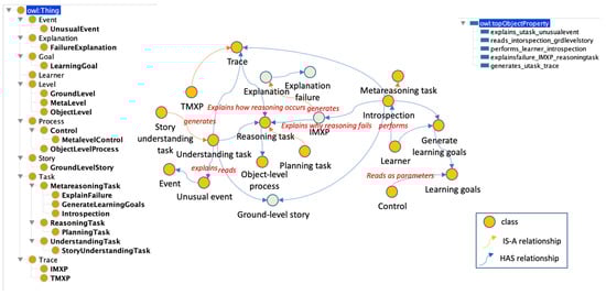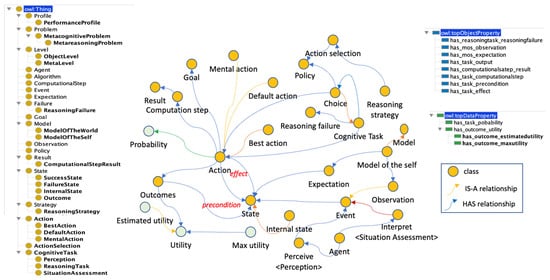 This section describes the relationships and properties of some class examples, but due to the large number that has been identified, we do not report all in the ontology. In cognitive systems with a metalevel-based architecture, the function of the object level (i.e., the reasoning level) is to recognize and solve problems or situations in the environment where the system operates. In contrast, the main function of the meta-level is to monitor and control the reasoning and learning processes that take place at the object level (Cox and Raja 2011; Nelson 1990). The objective of monitoring and control is to achieve more effective results in the processes carried out at the object level.